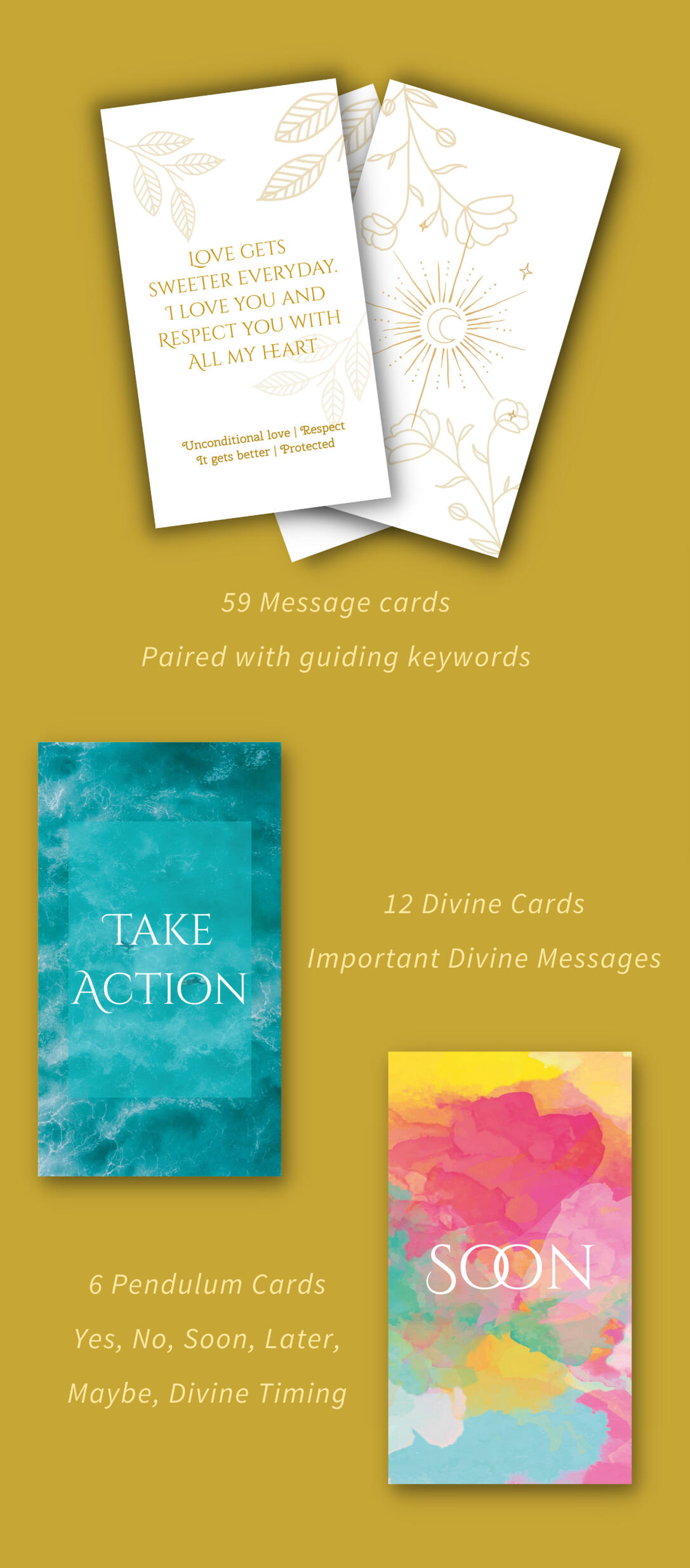 The deck is composed of 59 Message cards, 12 Divine cards and 6 Pendulum style cards.59 Message cards - These are messages, kind of a reply within a conversation or a piece of advice from a close friend. Fall in love with our higher communication messages and create a deep bond with your Divine Soul Guardians, Angels, Ancestors and/or Higher Self. All 59 Message cards have keywords on the bottom to help guide your intuition.12 Divine cards - These cards do not contain keywords, they are messages from your guides and are important propositions about direction & focus to be received from the heart.6 Pendulum style cards - These are your typical pendulum answers with a twist (yes, no, maybe, later, soon, divine timing). These can be taken out of the deck and used separately as a pendulum would. Shuffle and lay the cards on the table, ask a question and pick one up.One message can have multiple meanings, and its message can shift in accordance with the surrounding cards or question. The keywords are there to show you the different types of energies that can be part of the overall message. 2 people can say the same sentence but feel in different ways, or be living different circumstances when saying it, right? This is where the keywords come in, look through the words and keywords.